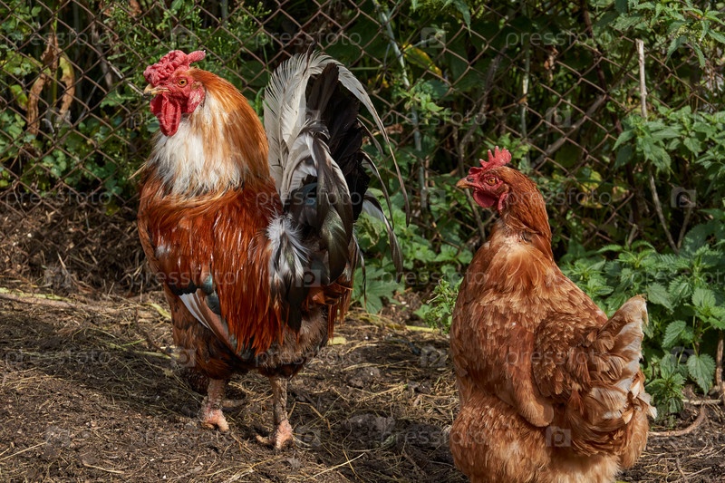 Петух и курица гуляют по лужайке и ищут что-нибудь съестное возле загородного дома