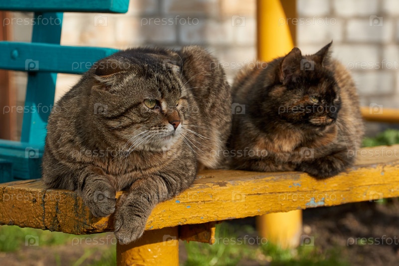 Домашние кошки лежат на скамейке во дворе дома и греются на вечернем солнце