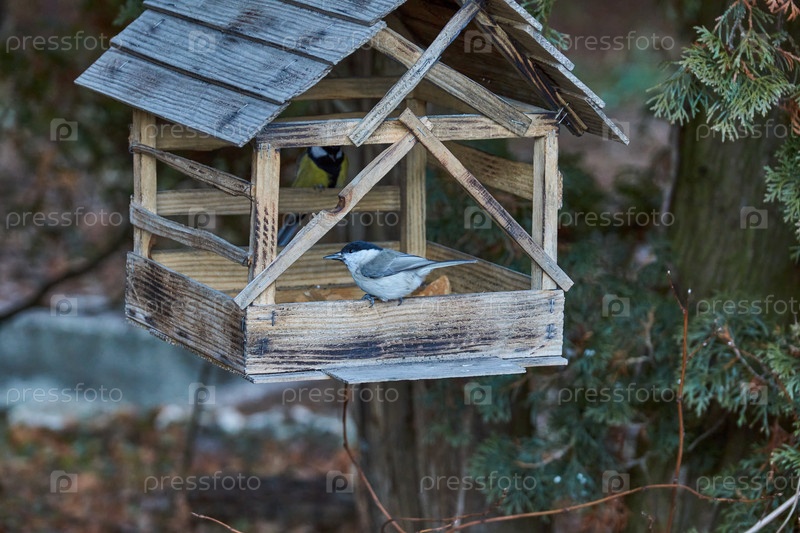 Синяя птица (лат. Poecile palustris или Parus palustris) и большая синяжка (лат. Parus major) прилетели на корм для семян. поздняя осень. ноябрь 2021 г