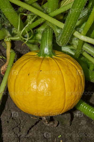 На грядке растет круглая желтая тыква. Лето
