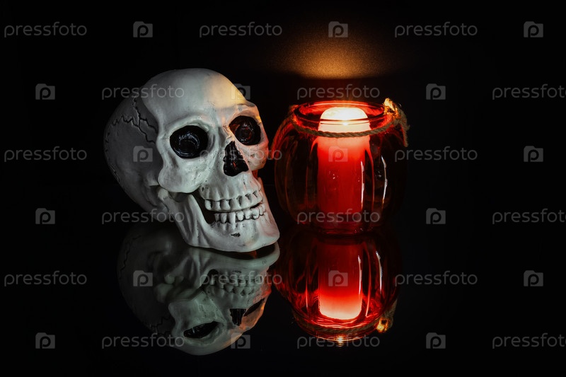 Натюрморт на Хэллоуин, пластиковый череп и стеклянный подсвечник в виде тыквы с горящей свечкой