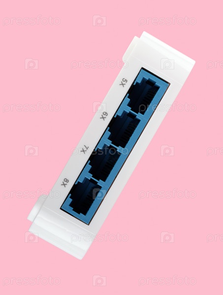 Белый 8-портный пластиковый коммутатор Ethernet изолирован на розовом фоне в сухой день