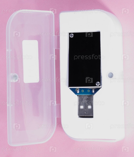 Электронное устройство в пластиковом корпусе на розовом фоне днем