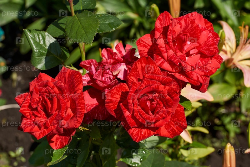 Красивые красные розы в саду после дождя. Лето