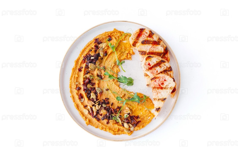 Хумус. Большая тарелка домашнего хумуса, украшенная гренками, плоская