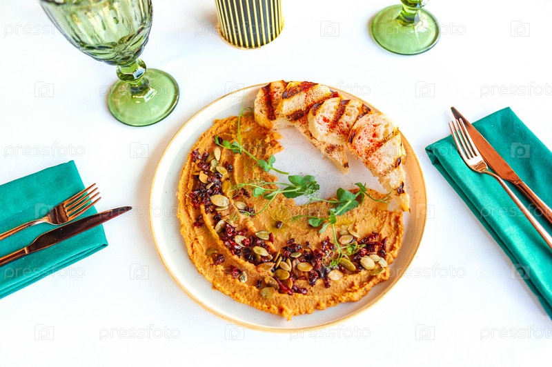 Хумус. Большая тарелка домашнего хумуса, украшенная гренками, плоская