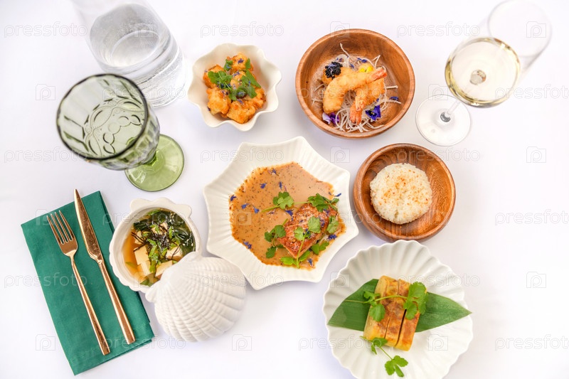 Набор японских блюд: суп мисо, тамаго, креветки темпура, рис