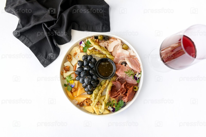 Тарелка средиземноморских закусок-антипасто. Плоская планировка, изолированная, над головой