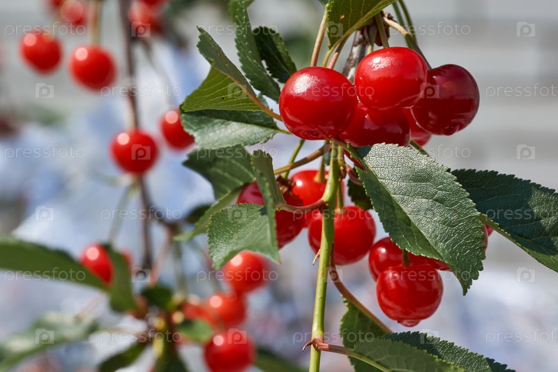 Плоды вишни на фоне голубого неба и зеленых листьев. В саду зреет вишня