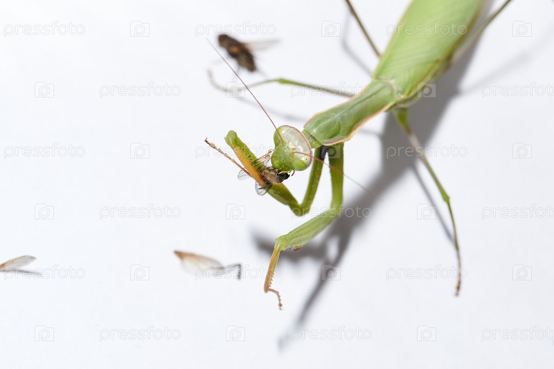 Обычный богомол (лат. Mantis religiosa) ест муху