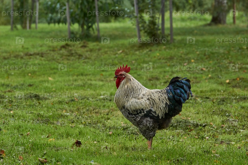Петух гуляет по лужайке и ищет что-нибудь съестное возле загородного дома