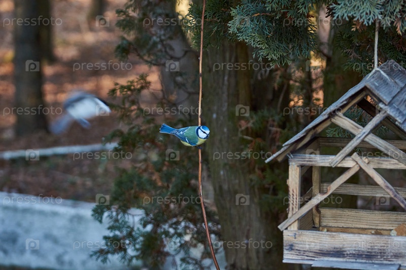Синяя сирень (лат. Cyanistes caeruleus или Parus caeruleus) прилетела в корм для семян В конце осени Ноябрь 2021 г