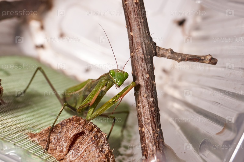 Обычный богомол (лат. Mantis Religiosa) ждет появления добычи вблизи для броска