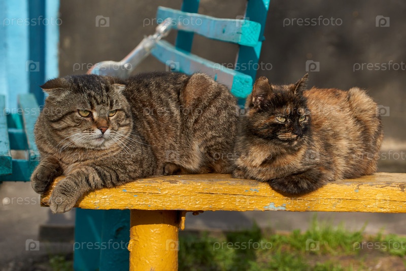 Домашние кошки лежат на скамейке во дворе дома и греются под вечерним солнцем