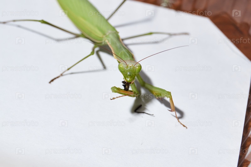 Обычный богомол (лат. Mantis religiosa) ест муху