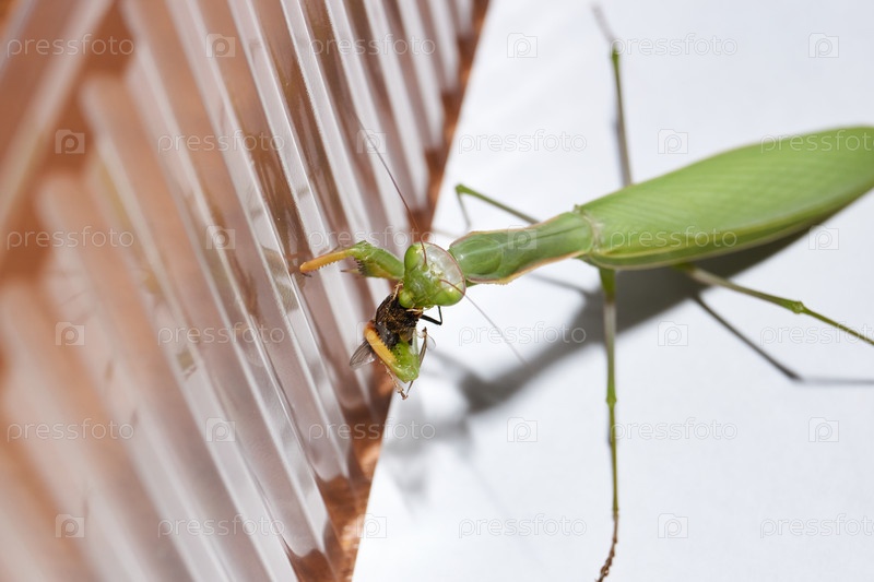 Обычный богомол (лат. Mantis religiosa) ест муху