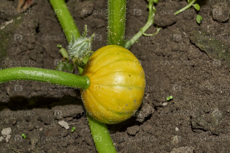 На грядке растет круглая желтая тыква. Лето