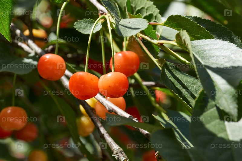 Плоды вишни на фоне голубого неба и зеленых листьев. В саду зреет вишня