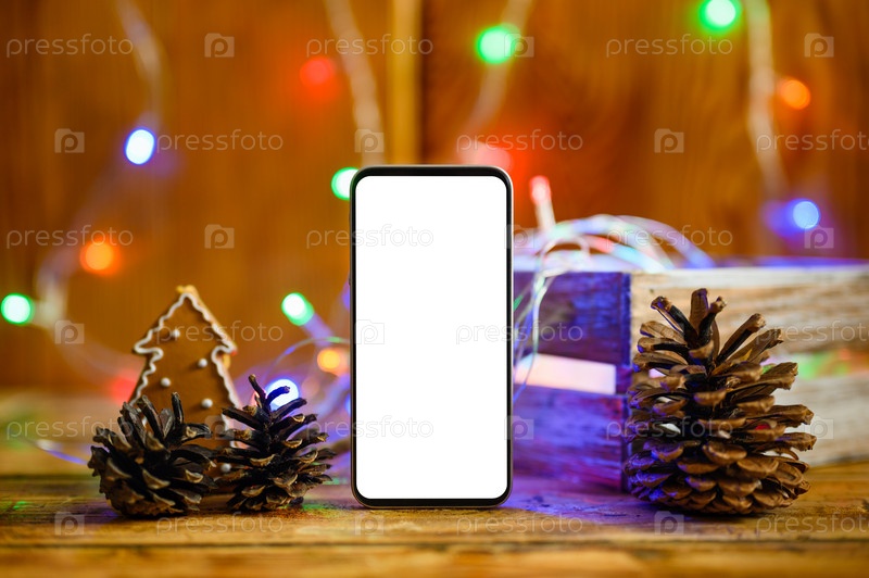 Смартфон с пустым белым дисплеем стоит рядом с сосновыми шишками. На заднем плане — боке от разноцветных гирлянд и рождественских украшений. Выборочная фокусировка