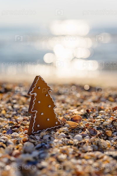 Новогодняя открытка. Печенье в форме елки и морская звезда с гирляндой на фоне заката и моря