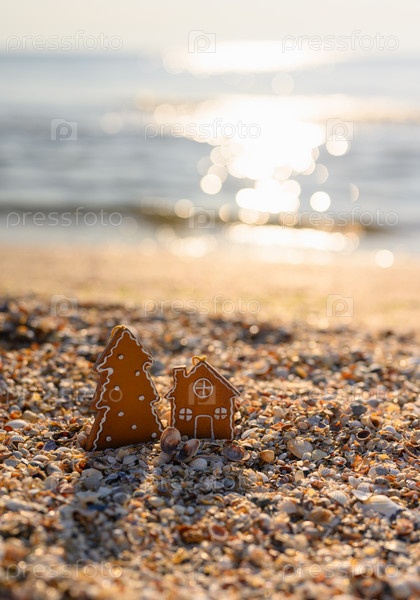 Новогодняя открытка. Печенье в форме елки и морская звезда с гирляндой на фоне заката и моря