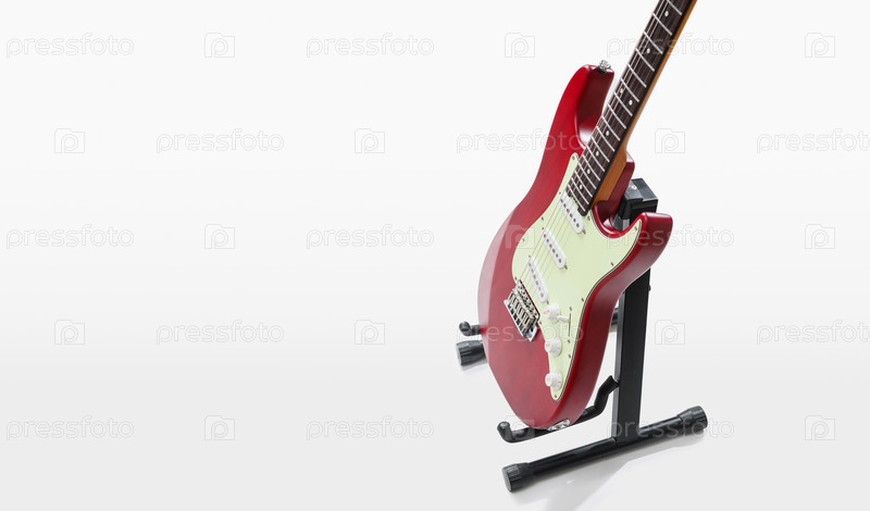 Электрогитара на подставке стоит на белом фоне в студии. Бесплатное место