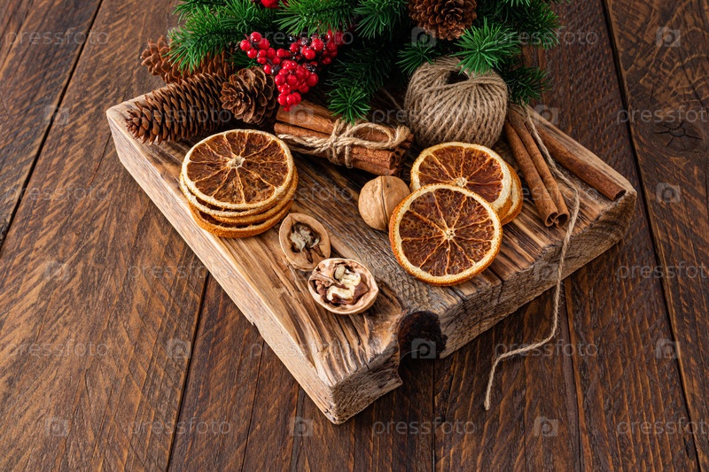 Сушеные дольки апельсина, грецкие орехи, палочки корицы, зеленые еловые ветки на деревянном подиуме и деревенском столе. Новогодняя рождественская концепция. копировать пространство
