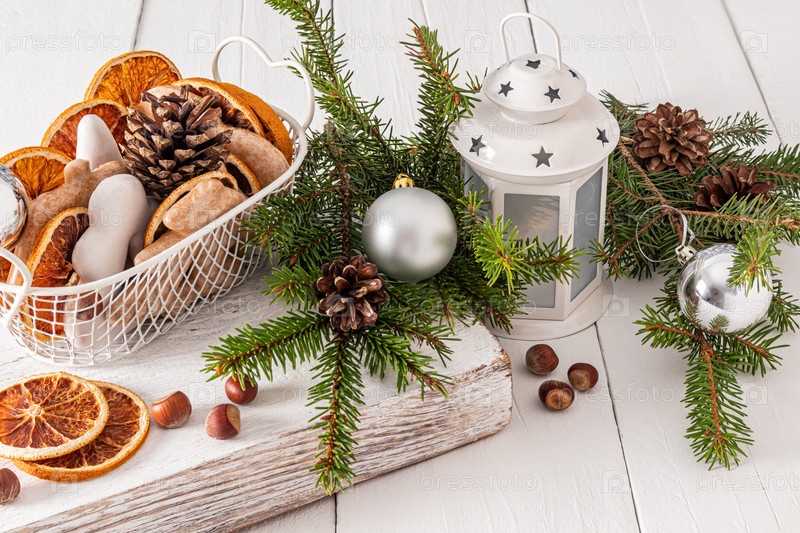 Концепция Нового года и Рождества. Белый фонарь среди еловых ветвей с игрушками и шишками и пряниками с глазурью в металлической корзине на деревянной доске