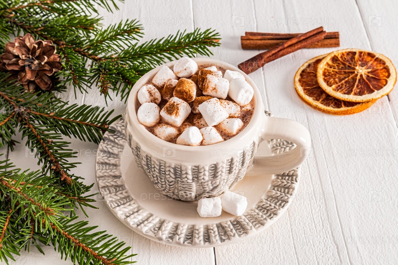 Красивая чашка с новогодним вязаным узором с горячим какао или шоколадным напитком с зефиром на белом деревянном столе. концепция уютного Рождества