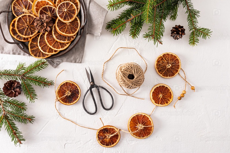 Вид сверху на белый текстурированный фон с домашней гирляндой из сушеных апельсинов, еловых ветвей, ломтиков апельсина и ножниц. Плоская планировка. украшение