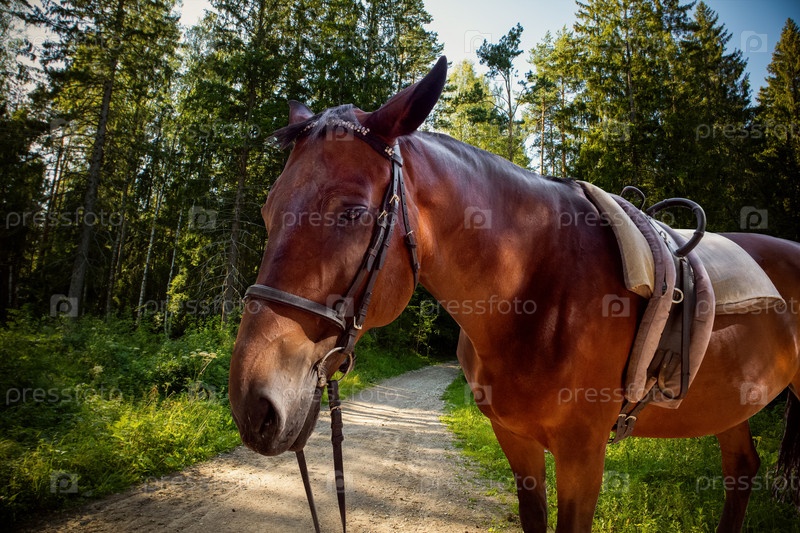 Коричневая домашняя лошадь стоит на лесной дороге летом