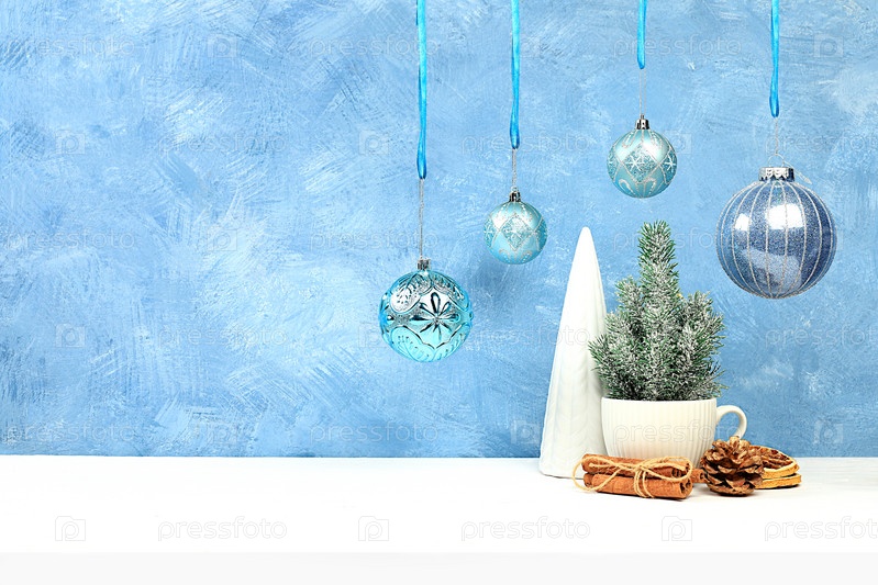 Пустой деревенский стол с живой елкой в кружке, сосновыми шишками и праздничными украшениями. Рождественский и новогодний макет для дизайна и демонстрации продукции, минимальная концепция счастливого Рождества, выборочный фокус