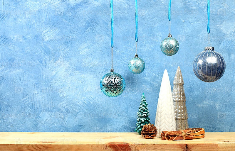Пустой деревенский стол с современными елочными фигурками, сосновыми шишками и праздничными украшениями. Рождественский и новогодний макет для дизайна и демонстрации продукции, минимальная концепция счастливого Рождества, выборочный фокус