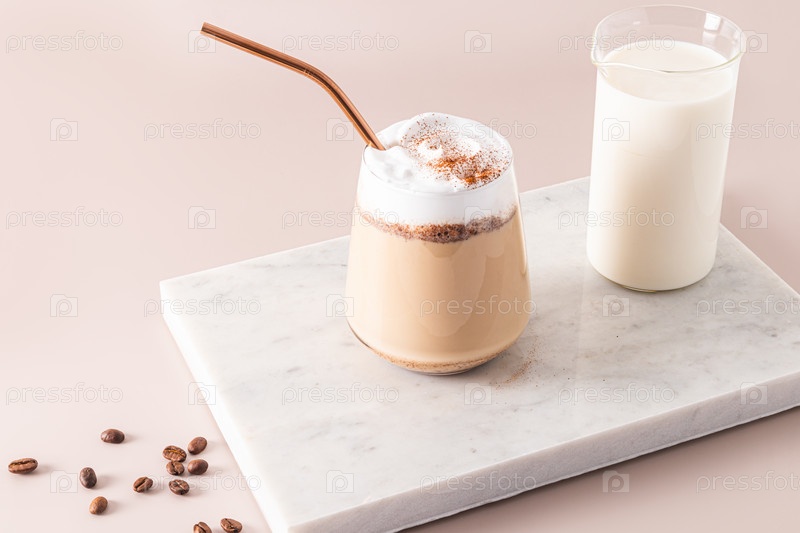 Большой стакан с шоколадным напитком и шоколадными дольками, латте с пеной на белом мраморном подиуме с кувшином молока. Идеальный десерт