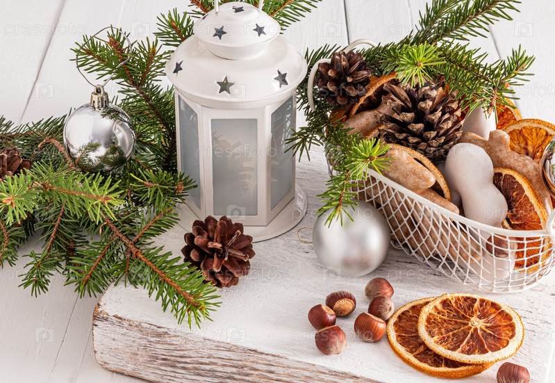 Рождественский фонарь, корзина с глазурованными пряниками и сушеными дольками апельсина, зеленые еловые ветки на белом деревянном столе. Традиционное угощение. боке