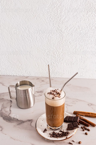 Высокий стакан с шоколадным напитком с корицей и кусочками шоколада стоит на тарелке и мраморном столе. кофе латте, моча. Вкусный напиток