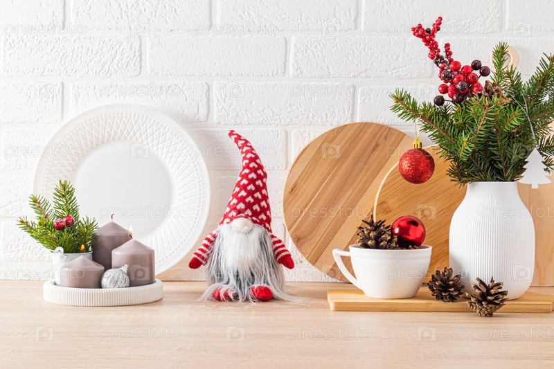 Уютный, комфортный дизайн интерьера, оформленный к празднику Нового года. Кухонная столешница с новогодней посудой, украшениями, свечами