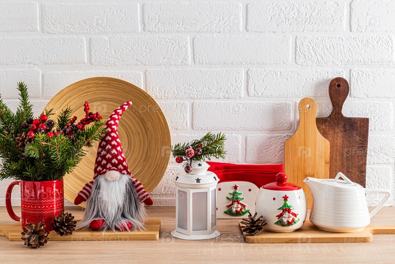 Шикарный кухонный фон, украшенный новогодними предметами, игрушками, посудой. Стена из белого кирпича. Деревянная столешница. Экологичная кухня