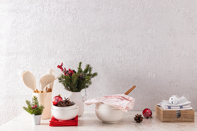 Украшенная кухонная столешница к Новому году и Рождеству в минималистичном эко-стиле. Передний план. Копировальное пространство
