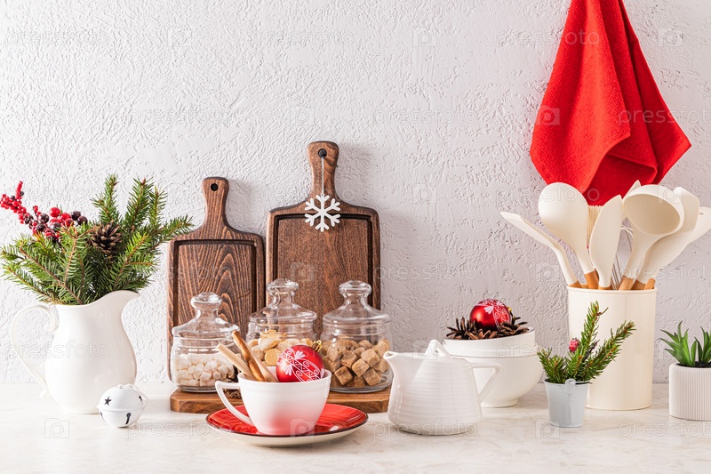 Зимний праздничный декор на рождественской кухне. Столешница украшена новогодними предметами, стильной посудой и кухонной утварью
