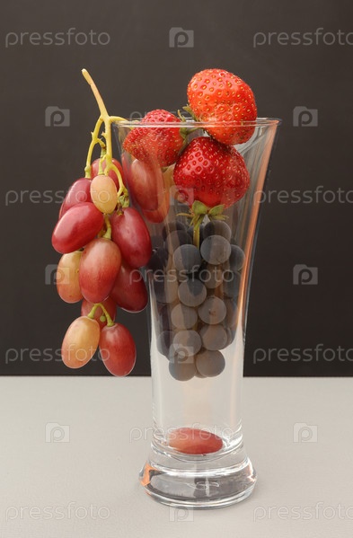 Виноград и клубника в стеклянном бокале