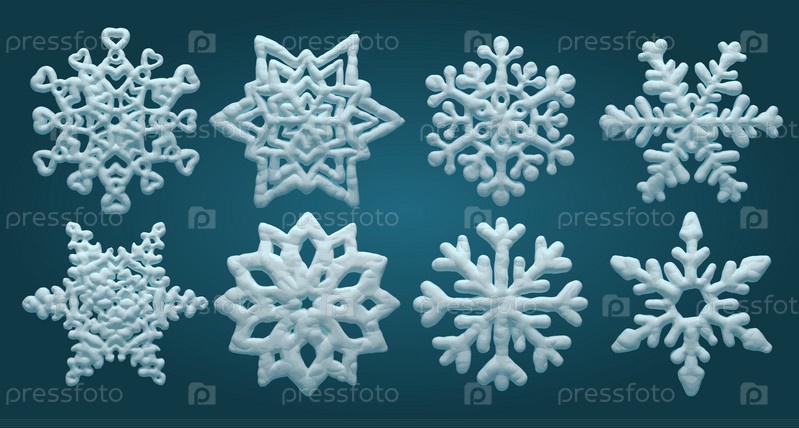 Набор векторных снежинок, объемный декоративный снег