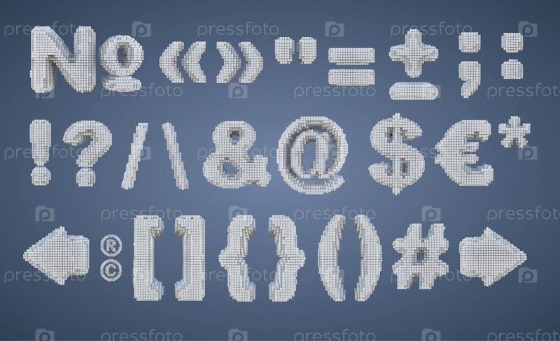 Воксельный текст белых символов на синем фоне, набор пиксельных знаков