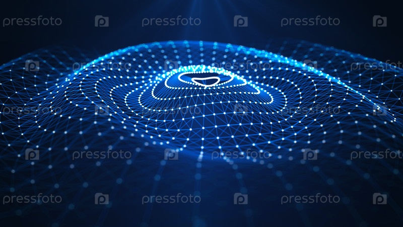 Футуристический фон. Волновой эффект паутины синих линий и белых точек. Понятие больших данных. Иллюстрация технологий и искусственного интеллекта. Эффект колебания частиц. 3D-рендеринг