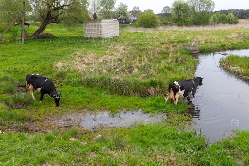Две черно-белые коровы пьют воду из реки
