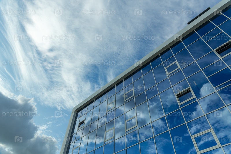 Архитектурная деталь фасада с множественными отражениями облачного неба и солнца. Внешний вид современного здания. Архитектура абстрактный фон