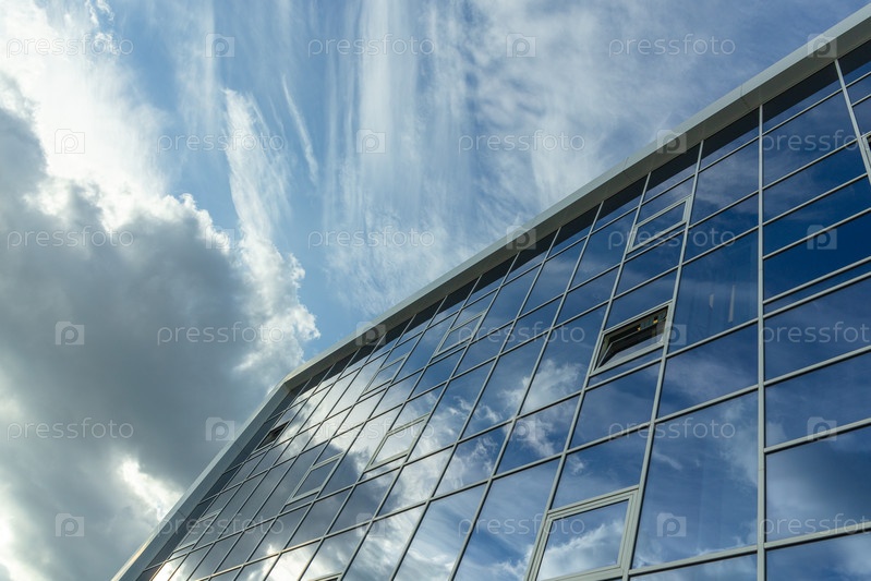 Архитектурная деталь фасада с множественными отражениями облачного неба и солнца. Внешний вид современного здания. Архитектура абстрактный фон
