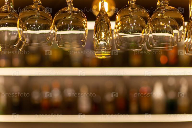 Чистые бокалы для вина висят над барной стойкой на расфокусированном фоне с полками с бутылками алкогольных напитков