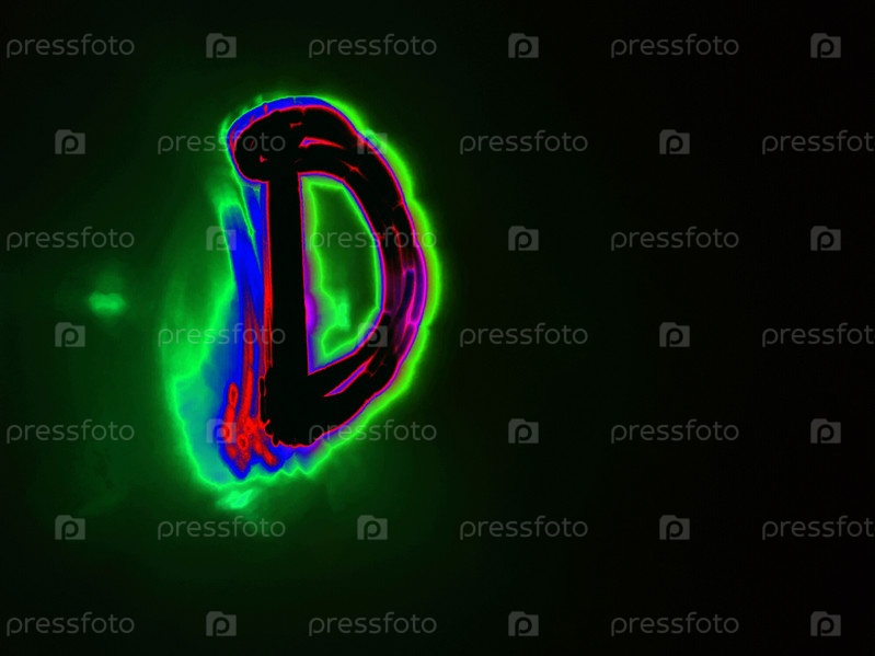 Светящаяся английская буква D. На черном фоне с цветными неоновыми линиями от руки написана буква английского алфавита. Буква светится розово-красным светом, создавая вокруг себя зелено-синий ореол