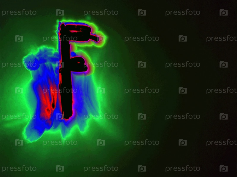 Светящаяся английская буква F. На черном фоне с цветными неоновыми линиями от руки написана буква английского алфавита. Буква светится розово-красным светом, создавая вокруг себя зелено-синий ореол